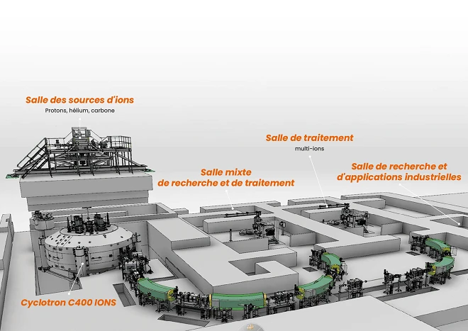 À partir de 2028, CYCLHAD proposera des faisceaux multi-ions — protons, ions carbone et hélium — disponibles dans trois salles d’irradiation dédiées, jusqu’à 400 MeV/u. Nos installations offriront une grande flexibilité de montage et de temps d’irradiation, adaptées à vos besoins expérimentaux.